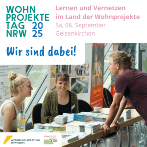 Der Wohnprojektetag NRW 2025 findet am Sa 6. September 10 – 16 Uhr im Wissenschaftspark Gelsenkirchen statt und richtet sich an Wohnprojekte, Fachleute und alle, die sich zu gemeinschaftlichem Wohnen informieren und vernetzen wollen.